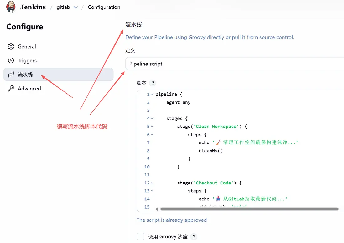 git push把本機代碼推送到gitlab服務器) gitlab服務器——用來存代碼(注意,gitlab上面的代碼,一般無法直接push到jenkins服務器上,需要jenkins主動從gitlab那裏去“撈”代碼)jenkins服務器——用來執行自動化cicd操作(jenkins把“撈”到的代碼執行npm run build構建操作,並把構建產物傳送到生產服務器)- 生產服務器——存放前端構建產物,並使用