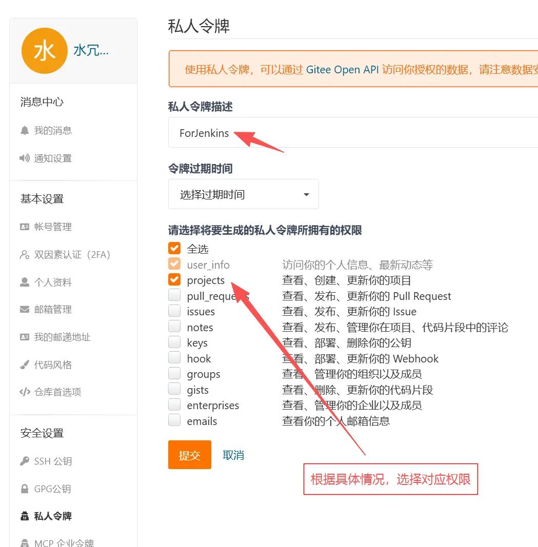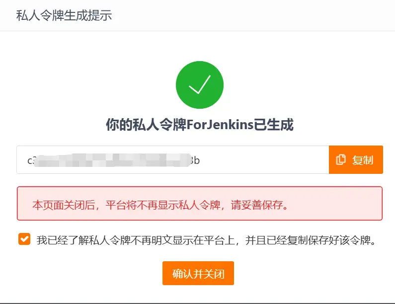 4. 妥善保存私人令牌,然後在jenkins中添加憑據使用此令牌