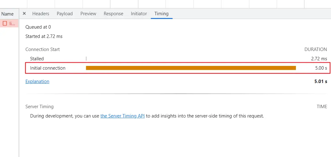 點開請求的Timing面板查看,發現請求卡在Connection Star的Initial connection地方不往下走了。