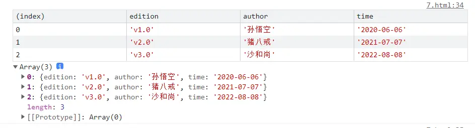 10. console.table()方法,用於在控制枱打印一個table表格,比如我們把項目更新的版本號時間之類的信息,以表格的形式呈現在控制枱上,代碼和示例圖如下: