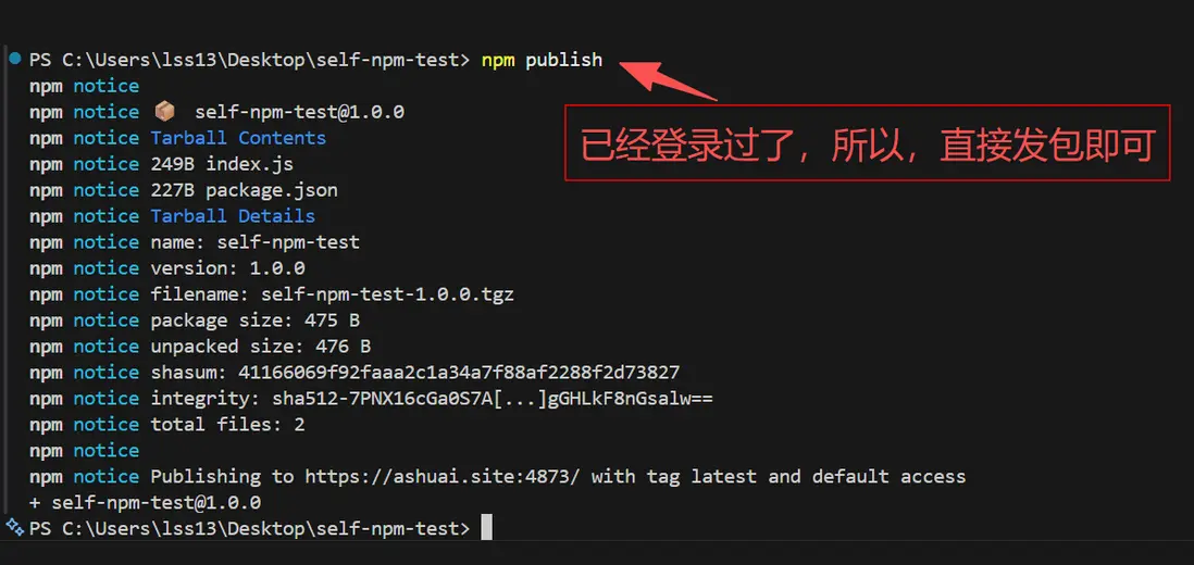 因為,我們先前已經登錄過了,現在只需要創建一個包,並直接發佈到私服npm上即可