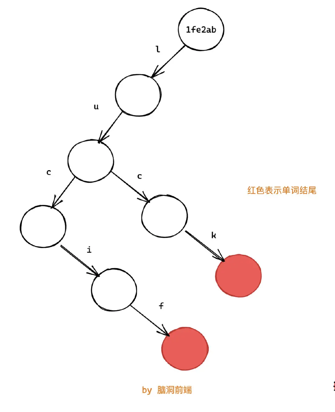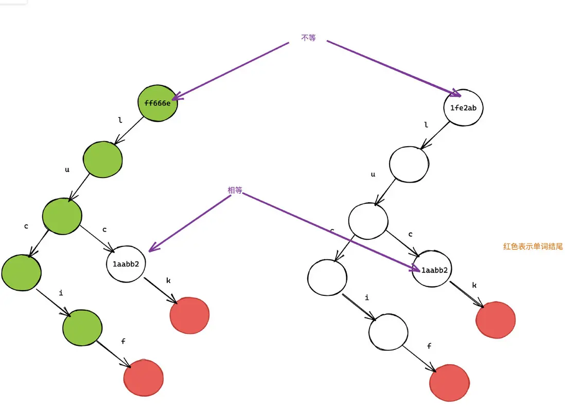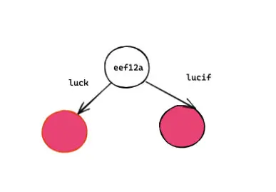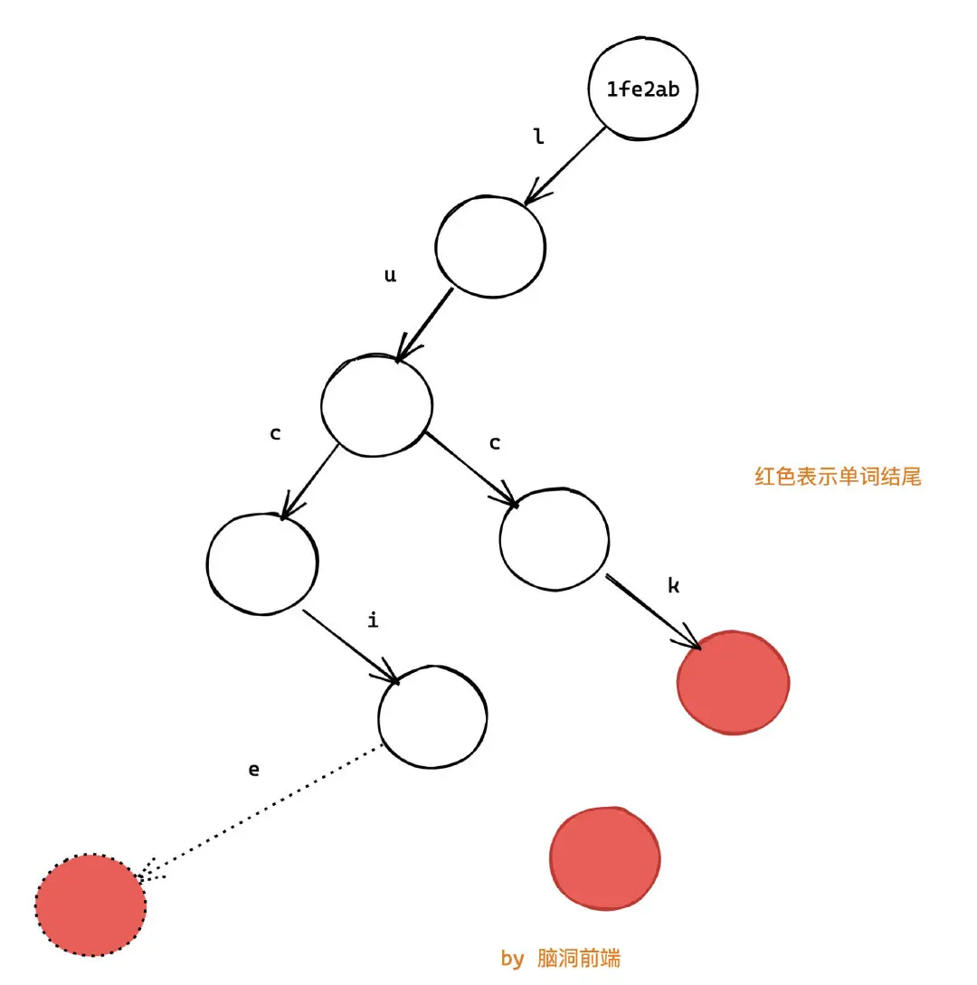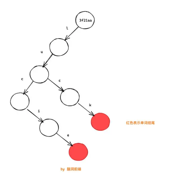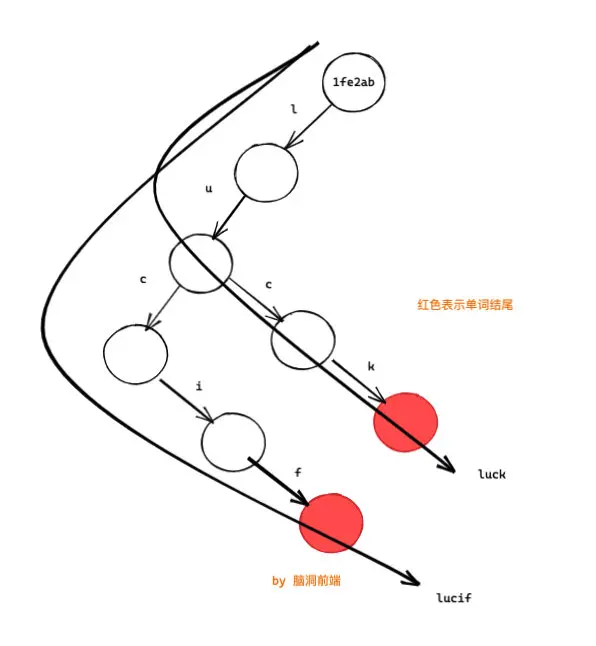 這樣我們就將兩個單詞 lucif 和 luck存到了樹上: