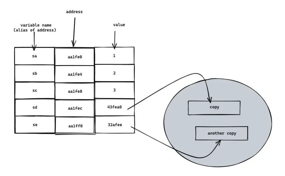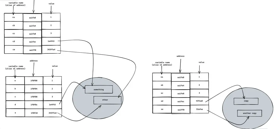可以看出,ca,cb,cc,cd,ce 的內存地址都變了,但是值都沒變。原因在於變量名只是內存的別名而已,而賦值操作傳遞的是 value。