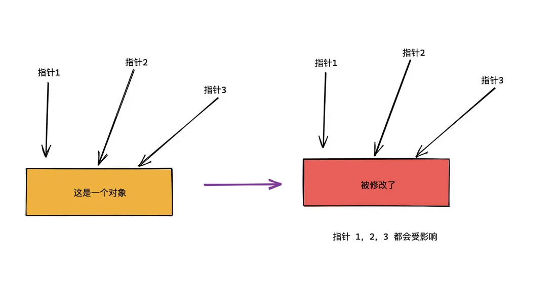 比如有一個對象被三個指針引用,如果對象被修改了,那麼三個指針都會有影響。