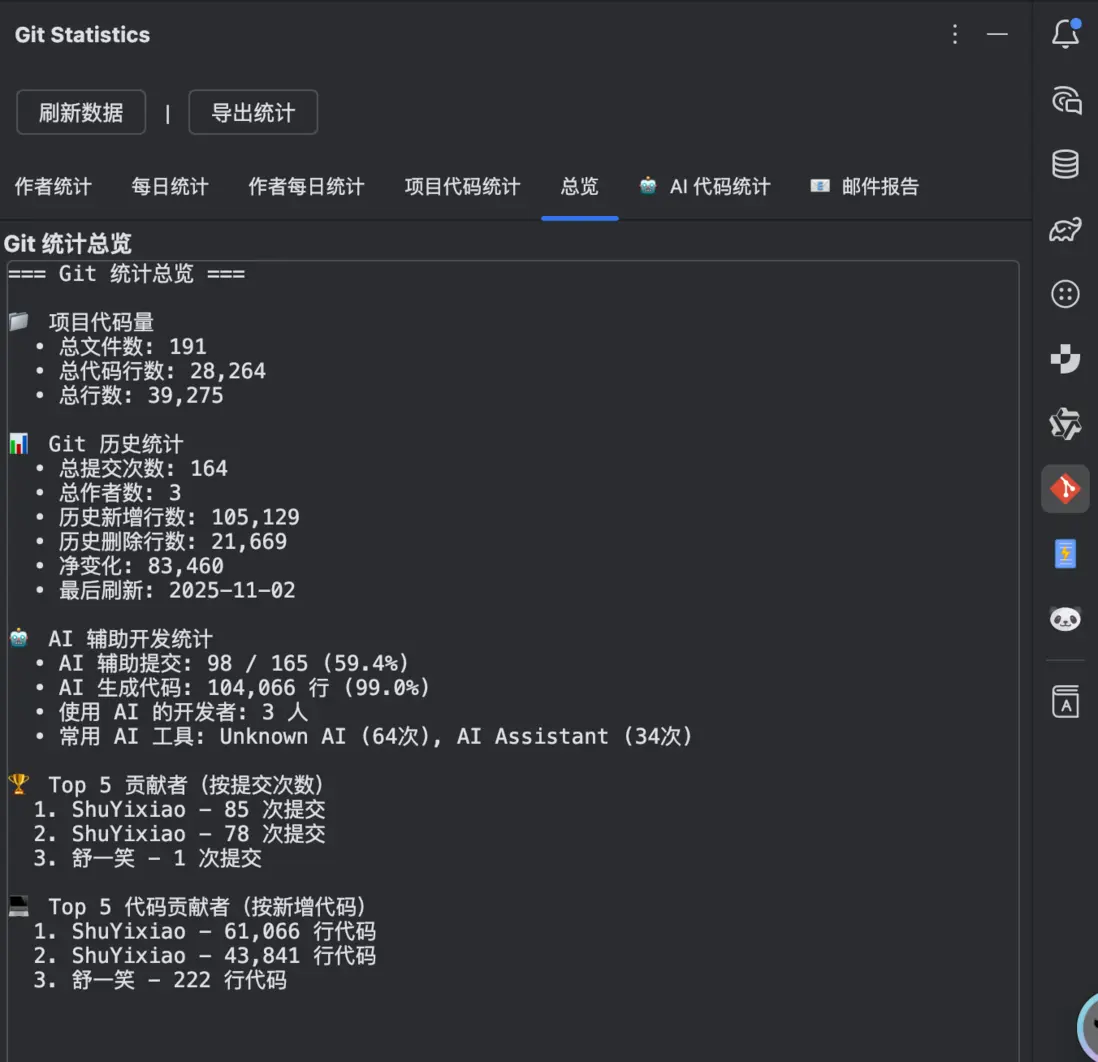 • 🤖 AI 統計:個人 AI 輔助開發統計(AI 代碼佔比、工具使用情況)
