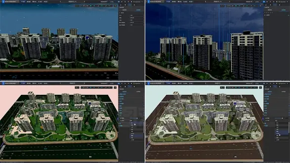 為了讓園區場景更加逼真,我深入使用了14層PBR物理材質編輯功能。通過調整金屬度、粗糙度等參數,讓園區內的建築外牆、玻璃幕牆、金屬設施都呈現出真實的質感。配合精細的光照系統,即使在端渲染模式下,效果也堪比流渲染。