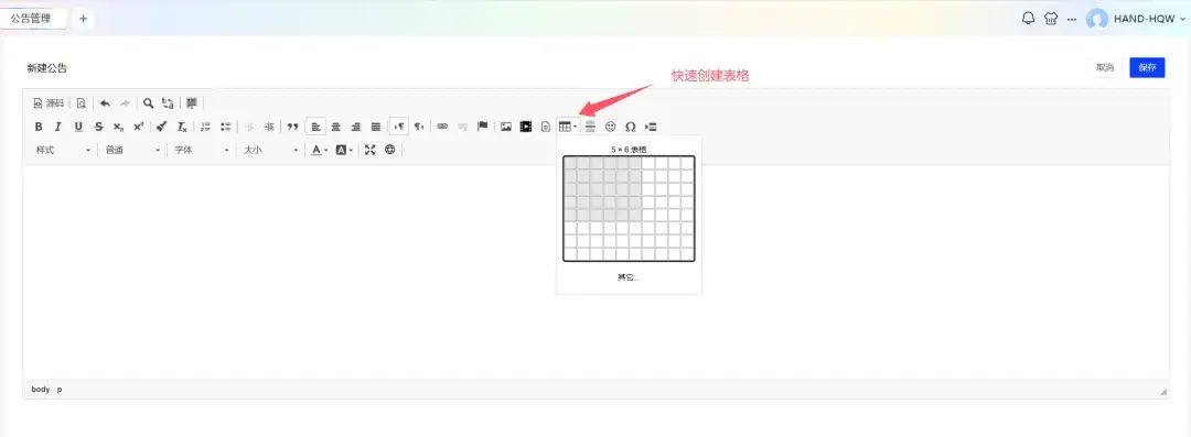 支持選中柵格創建相應行列數的表格,不用手動填寫行列數。