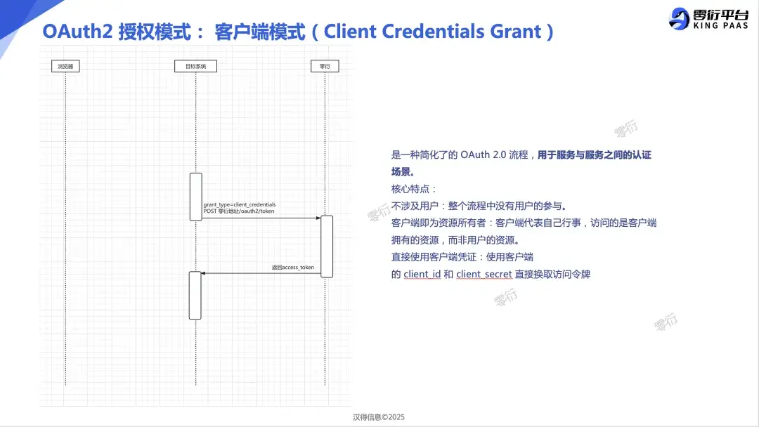 一種出現在服務於服務之間的授權協議,單點登錄的場景裏一般情況不會使用。在OAuth2.1已經廢棄,但是在歷史的架構裏非常常見,因此零衍額外單獨提供該協議以方便過渡使用。 - OAuth2 授權模式: 客户端模式(Client Credentials Grant)