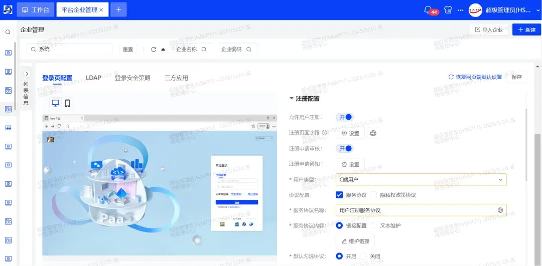 ◈ 協議配置: 支持配置是否展示註冊協議,以及維護協議內容,默認是否勾選等。
