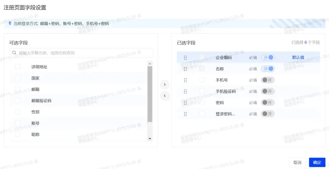 ◈ 註冊頁面字段: 20+字段的自由組合,支持新增個性化拓展字段,快捷拖拽排序,自定義註冊頁面的字段展示和順序,靈活適配多種業務場景。