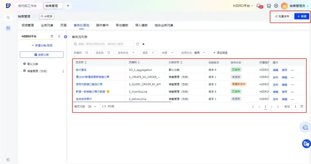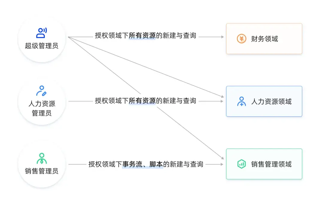 場景示例:銷售管理員擁有“銷售管理”領域中的事務流和腳本的新建與查詢(編輯、刪除)權限。