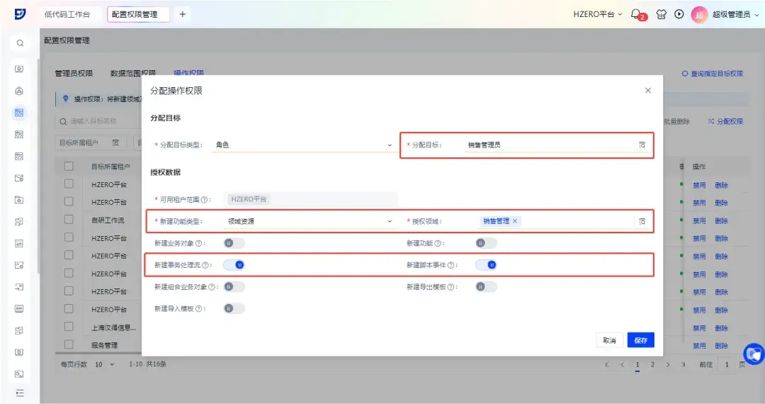 進入操作權限Tab頁,點擊<分配權限>:分配目標選擇“銷售管理員”,授權功能類型選擇領域資源後勾選需授權的領域,開啓需授權功能的開關,即可完成新建權限的分配。