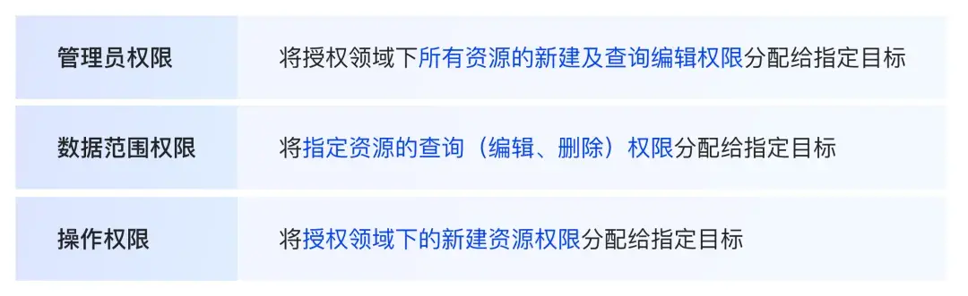 飛搭支持三種類型的權限分配方式:管理員權限、數據範圍權限以及操作權限。