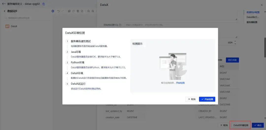 該功能提供一鍵式的自動化檢查,在任務執行前對運行環境進行全面的健康檢測,主動發現並排除環境隱患,有效避免任務因環境問題而失敗,確保DataX數據同步任務的穩定性和可靠性。