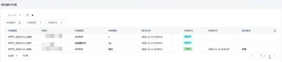 新增我的操作申請菜單界面,用於查詢本人的申請記錄;新增操作申請審批菜單界面,用於查詢待審批的待辦記錄、已審批的記錄歷史,以及完成審批申請操作 - 申請狀態控制