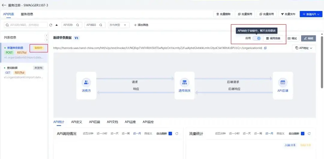 處於審核中的API、編排、連接器、前置機無法進行發佈、刪除等變更數據的操作