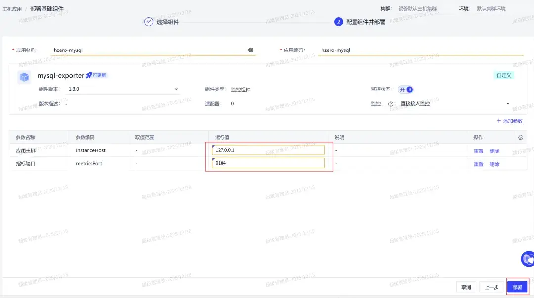 ## 部署對應的中間件監控Exporter ./mysqld_exporter --web.listen-address=0.0.0.0:9104 --config.my-cnf=/u01/app/hzero-mysql/conf/mysqld_exporter.conf ./redis_exporter -web.listen-address=0.0.0.0:9121 -redis.addr=localhost:7379 -redis.password=xxx