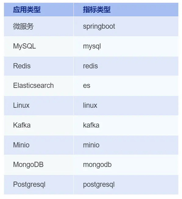 metricsType:監控指標類型(springboot,mysql,redis,es,linux,kafka,minio等)