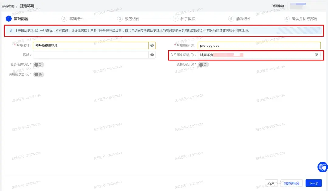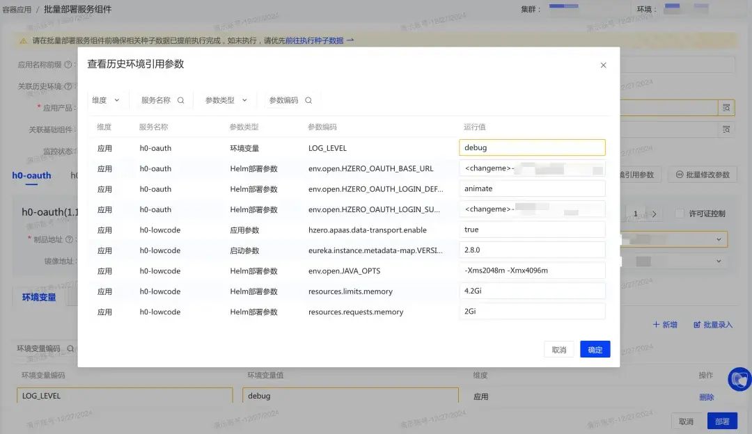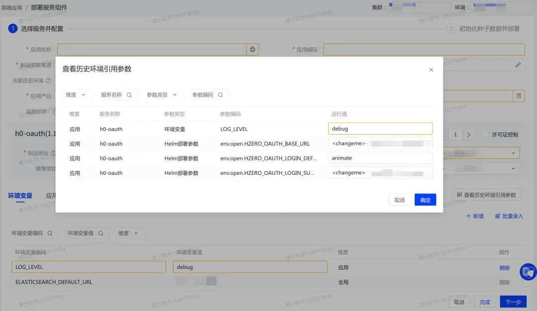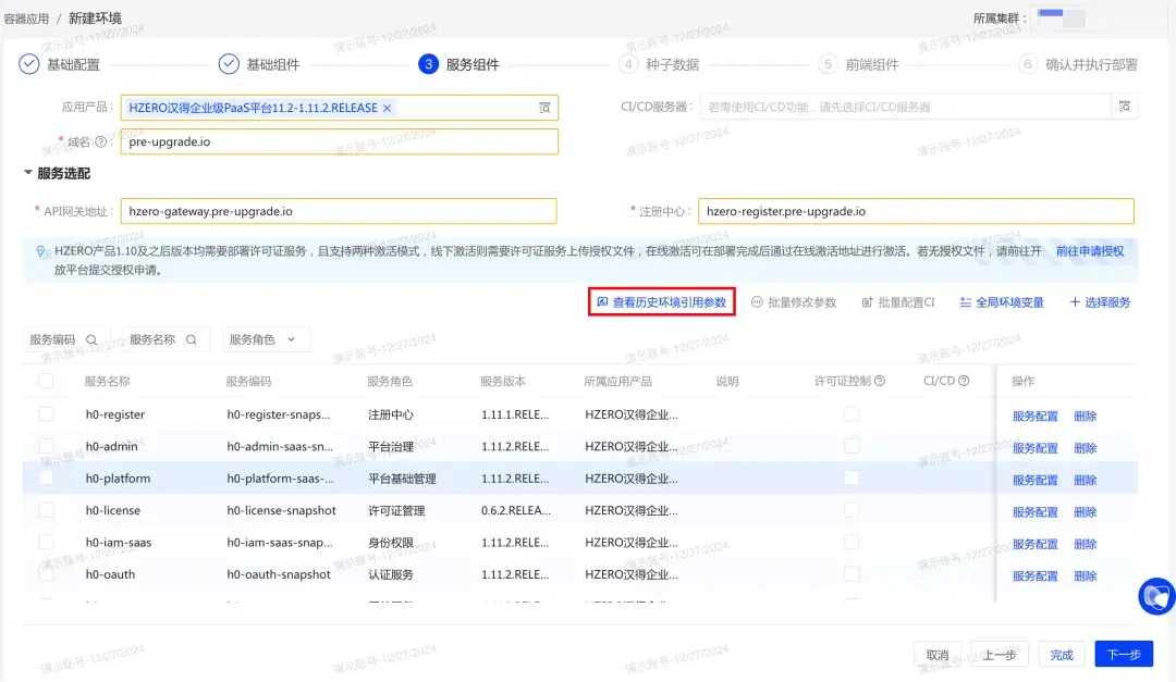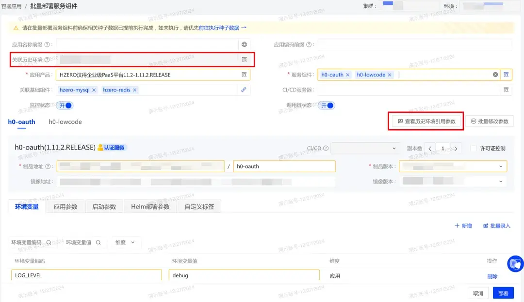 系統將會自動匹配關聯歷史環境中的相關服務,並自動繼承相關服務配置(例如:應用參數、啓動參數、部署參數、環境變量等。)