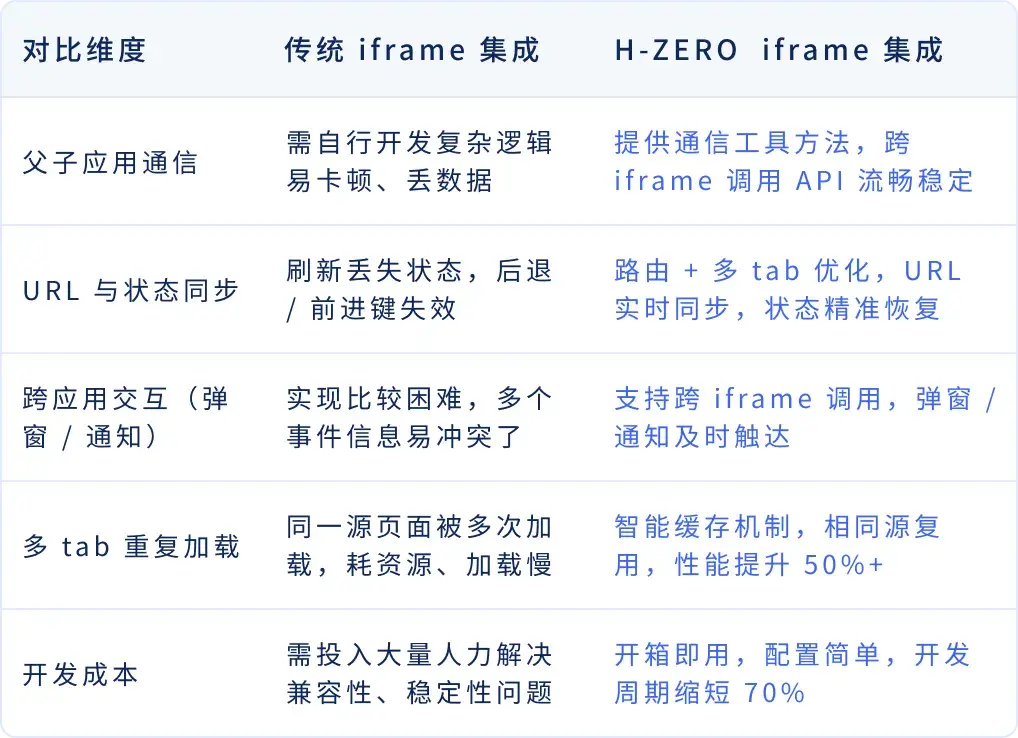 不管是企業想給核心系統 “搭積木”(嵌第三方工具),還是服務商想給產品 “加 buff”(接 AI 知識庫等),H-ZERO 的 iframe 能力都能讓集成變簡單 —— 無需複雜開發,不犧牲用户體驗,快速實現系統協同與能力升級。