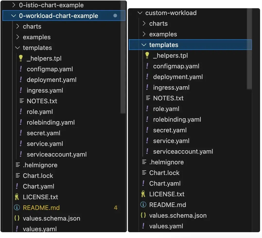 我們提供兩類製品模板供您快速開始,其中 0-istio-chart-example 用於服務治理類組件, 0-workload-chart-example 用於工作負載類組件,可以幫我們快速搞定如下各種骨架邏輯,通過少量修改(例如,修改默認端口、增加應用啓動參數、增加擴展資源類型等等)即可快速實現一個符合業務需求的定製化應用製品(本例中是 custom-workload ):