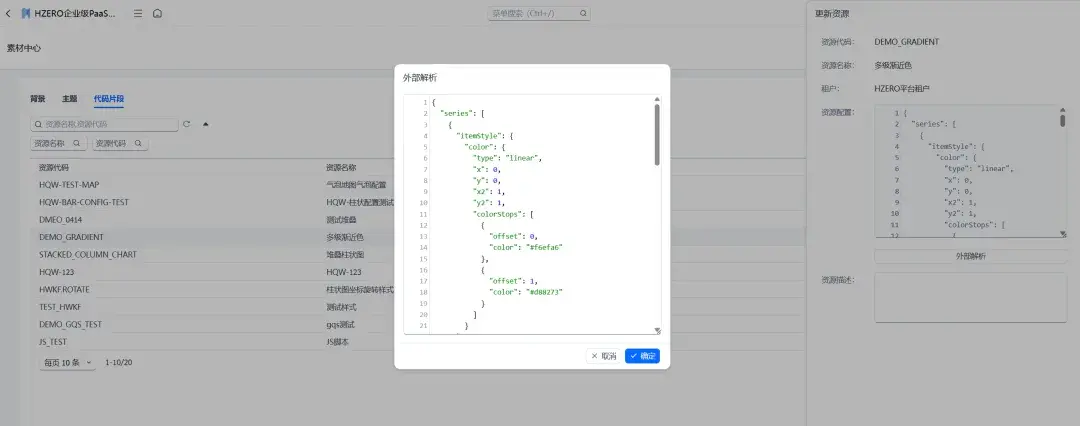比如:儀表板組件支持 JSON 格式的代碼片段配置,如下圖所示
