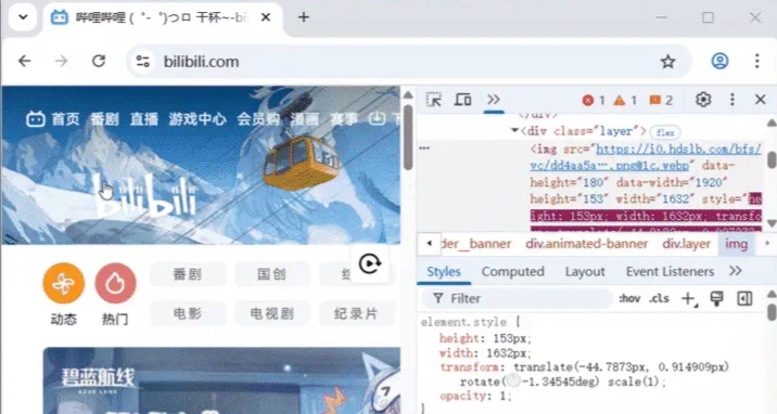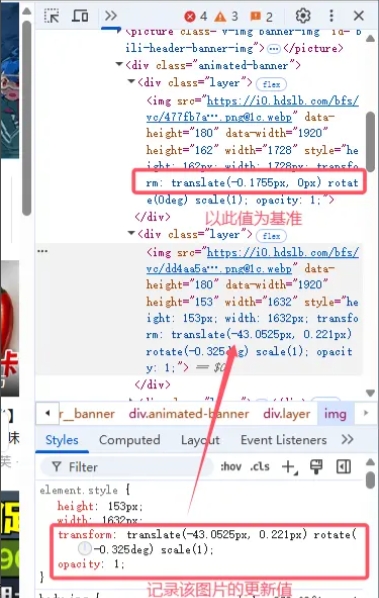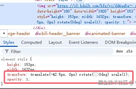 在 Banner 上移動鼠標,我們會發現 transform 屬性的各項值會隨着鼠標的移動而更新: