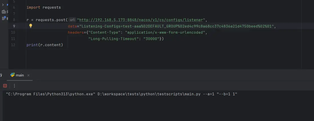 為了進一步調試解決問題,依據 https://nacos.io/zh-cn/docs/open-api.html 文檔中對/nacos/v1/cs/configs/listener接口定義,編寫python腳本單獨調試該接口,