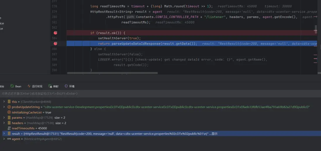 通過斷點調試確認,是在使用/nacos/v1/cs/configs/listener nacos api監聽配置文件修改事件時始終返回配置文件已修改,導致spring一直在重複拉取配置文件信息,如下:
