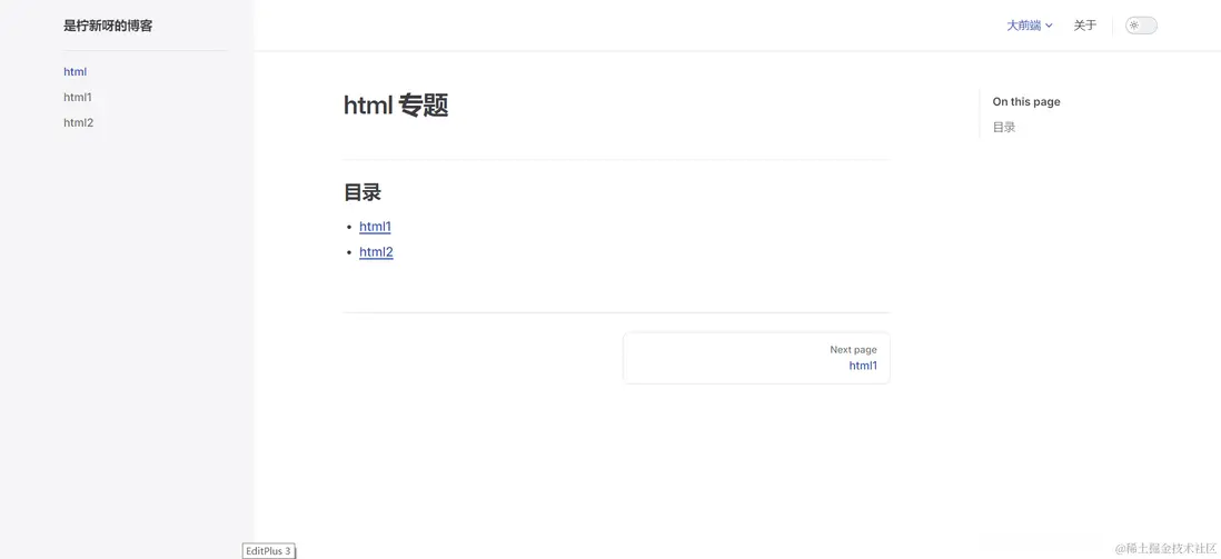 此時我們已經配置完畢側邊欄,並且還創建了一個專題目錄,但是我們看到下方的下一篇仍是顯示的英語Next page,如果想要修改的話我們再在themeConfig中配置一下docFooter就可以了,具體如下