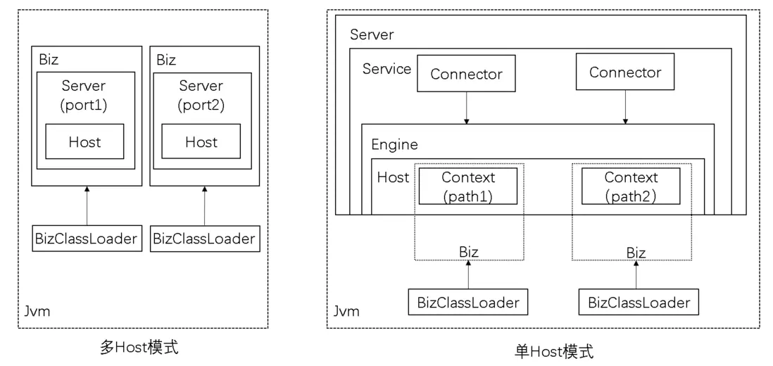 - 多 Host 模式:使用多個 port 進行區分。該模式的問題首先在於重複創建了 Tomcat 相關的資源,造成資源的浪費;其次是每個 Biz 有自己的端口,不利於整個 Ark 包應用整體對外提供服務。