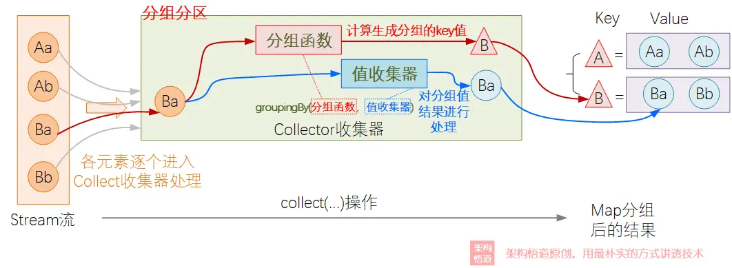 Collectors工具類中提供了groupingBy方法用來得到一個分組操作Collector,其內部處理邏輯可以參見下圖的説明: