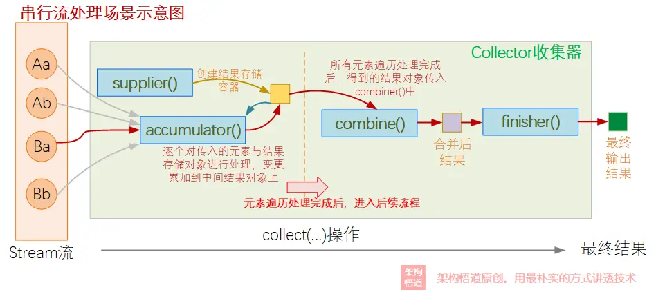 accumulator方法是實現具體的計算邏輯的,也是整個Collector的核心業務邏輯所在的方法。收集器處理的時候,Stream流中的元素會逐個進入到Collector中,然後由accumulator方法來進行逐個計算: