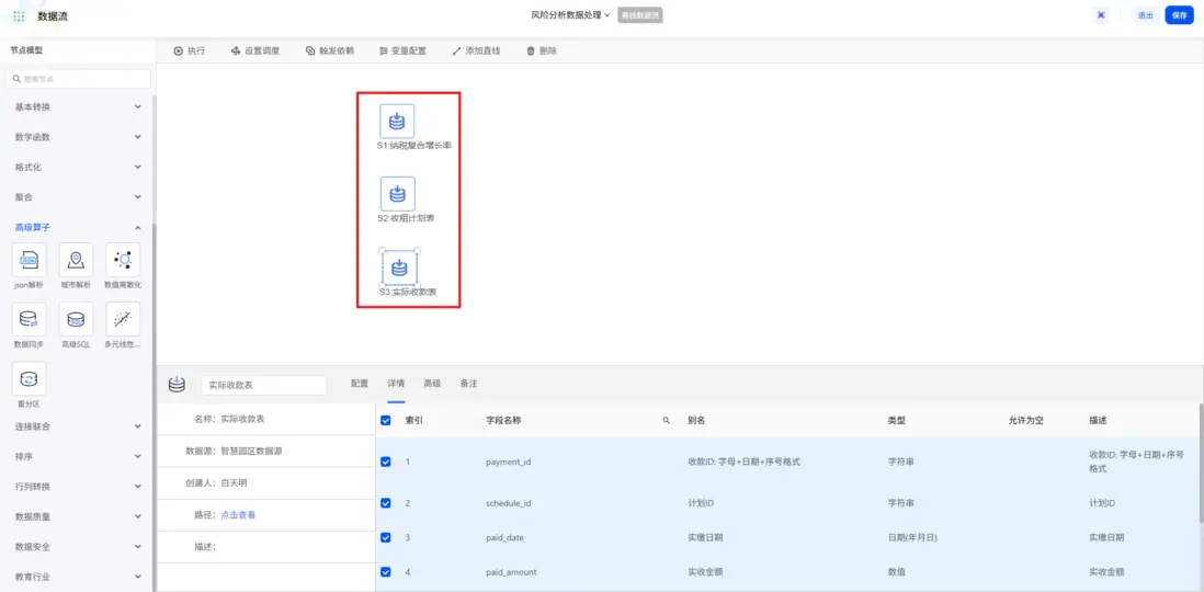 我們通過多種節點與SQL語句結合,成功實現了這一複雜的數據處理與分析,得到了各個企業的收繳率和風險指標,有利於後續對不同風險等級企業的差異化、精準化監管與服務。