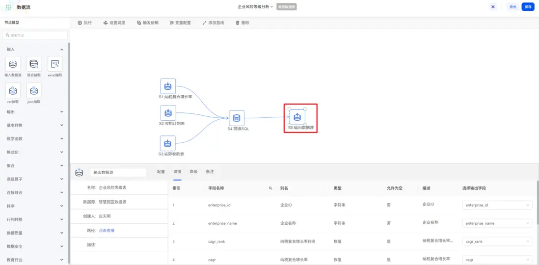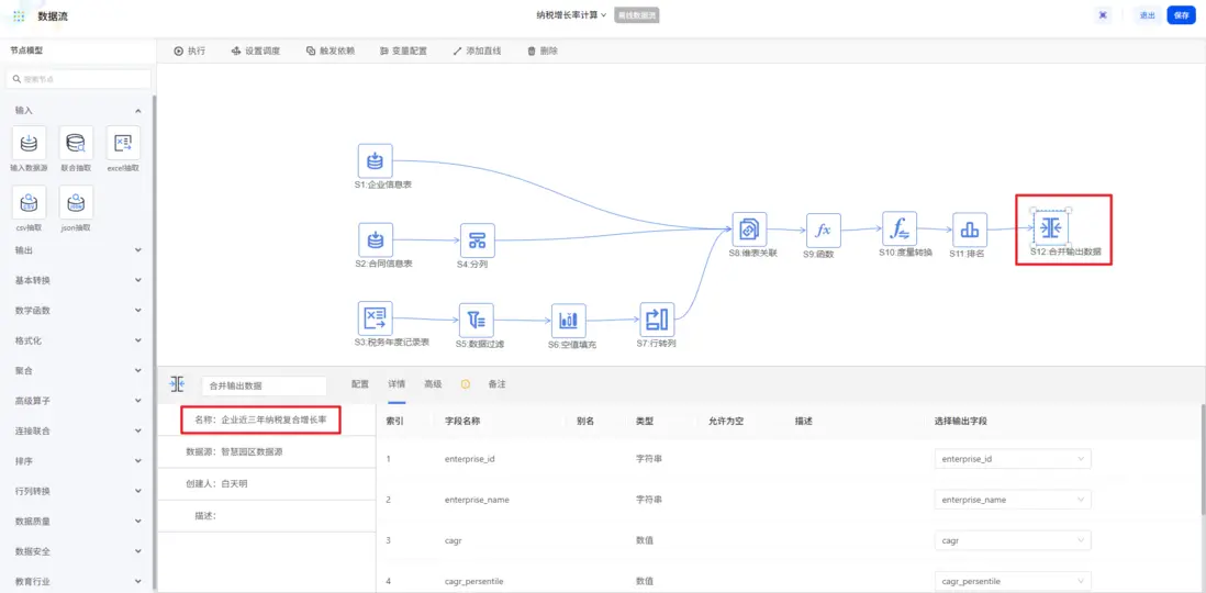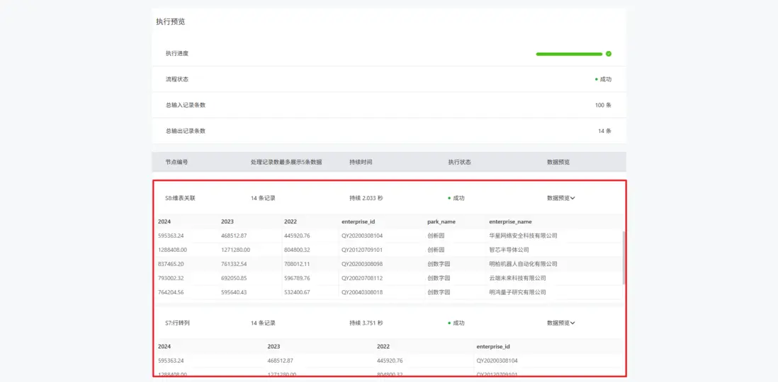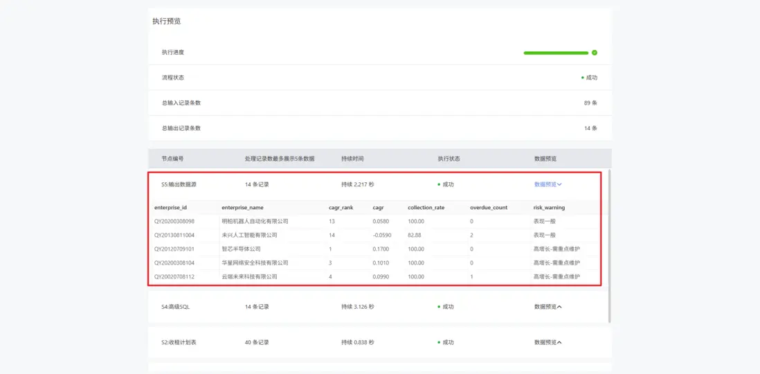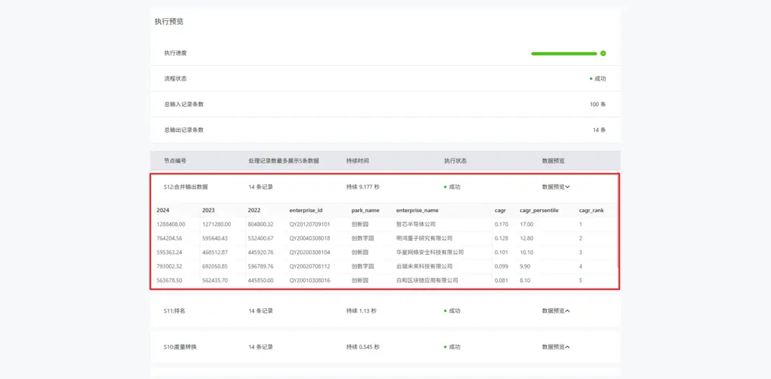 現在我們已經完成了所有節點的配置,執行交換機後,很快就能得到包含企業 ID、園區名稱、企業名稱、納税複合增長率以及排名的完整資產表。