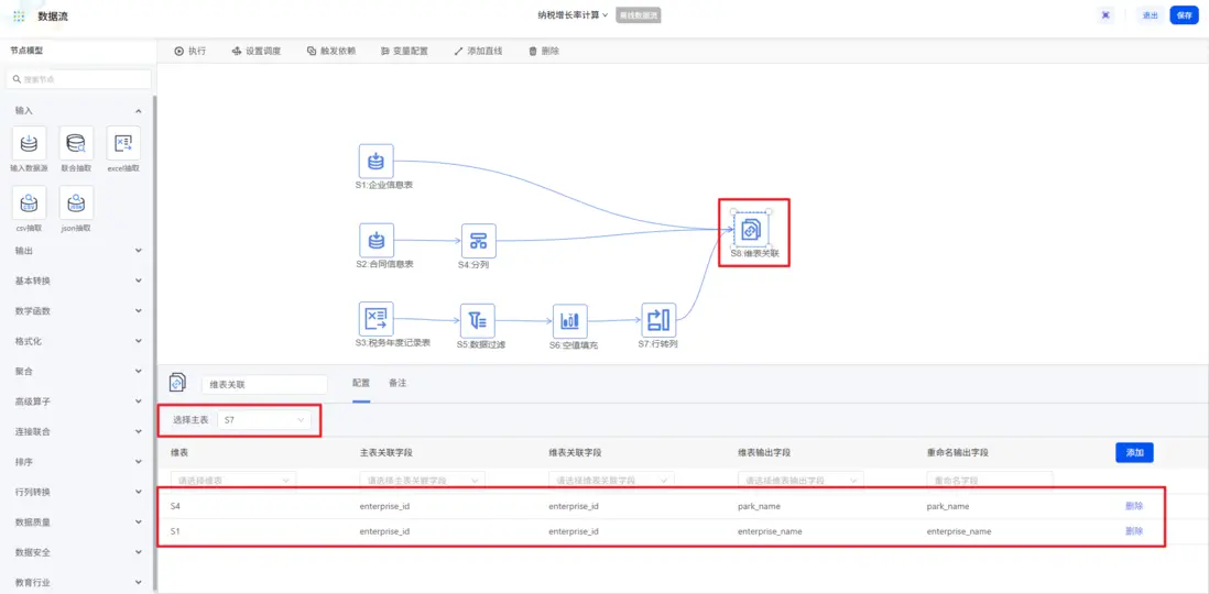 數據清洗與轉換完成後,需要將分散在三張表中的數據關聯起來,獲取所需的字段,形成完整的數據表。使用「維表關聯」的節點,將三張表根據企業ID關聯起來,輸出所需的字段。