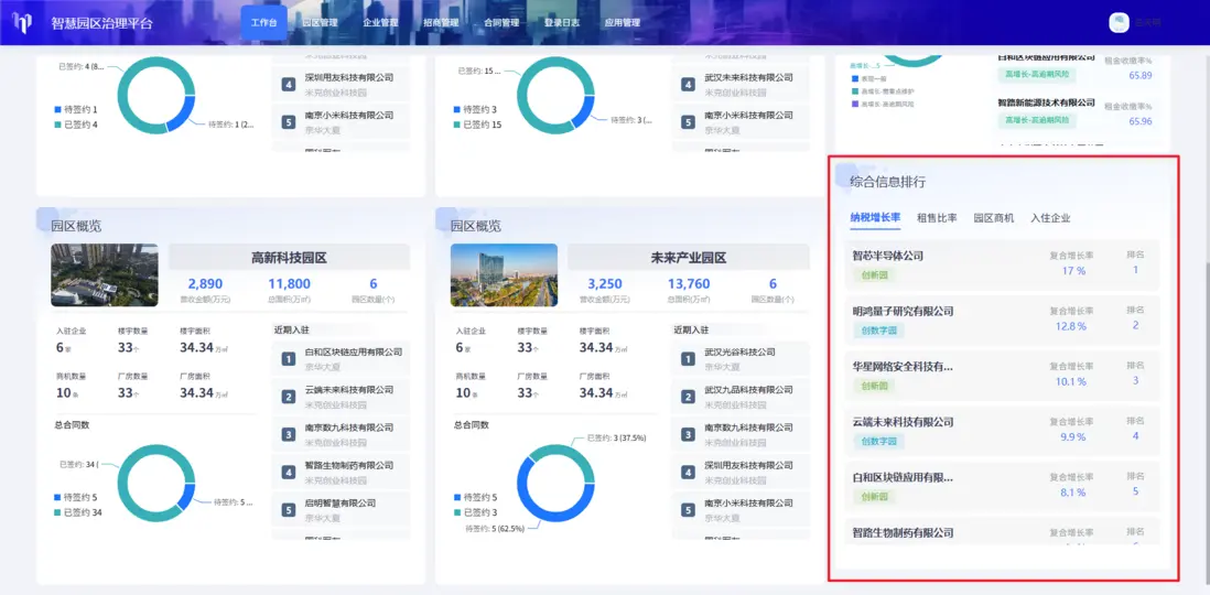 完成數據輸出後,來到智慧園區應用中,進行可視化展示。在工作台頁面的畫布列表中,綁定剛剛生成的資產表。預覽後,可以看到排行榜中直觀展示了不同園區每家企業的納税增長排名和對應的增長率。