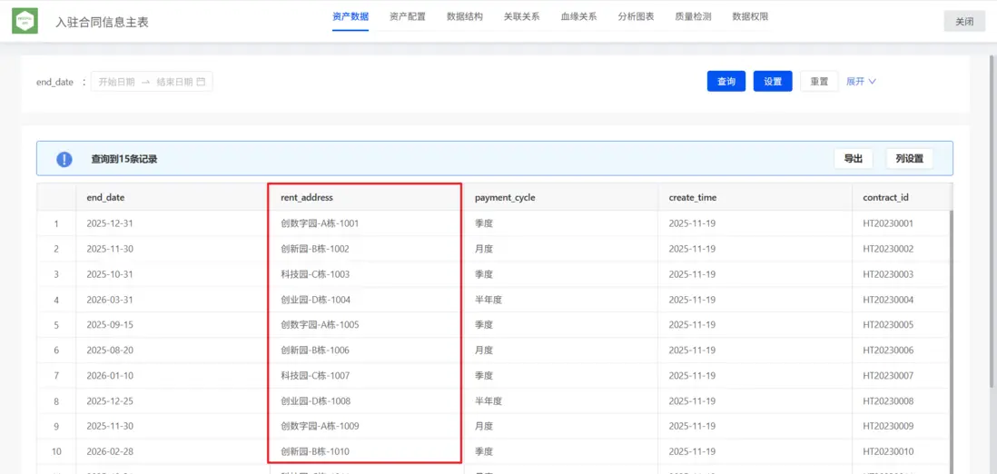 在“合同信息表”中,“租用地址”字段將園區地址、樓棟號、樓層號通過橫線連接存儲,需要通過該字段獲取到園區名稱。