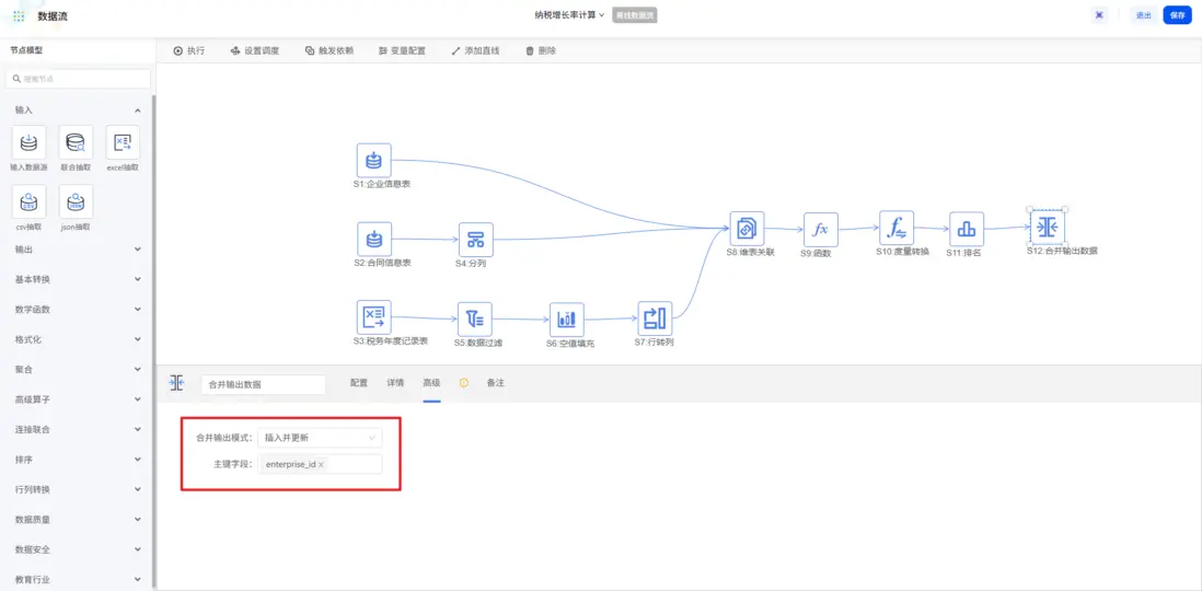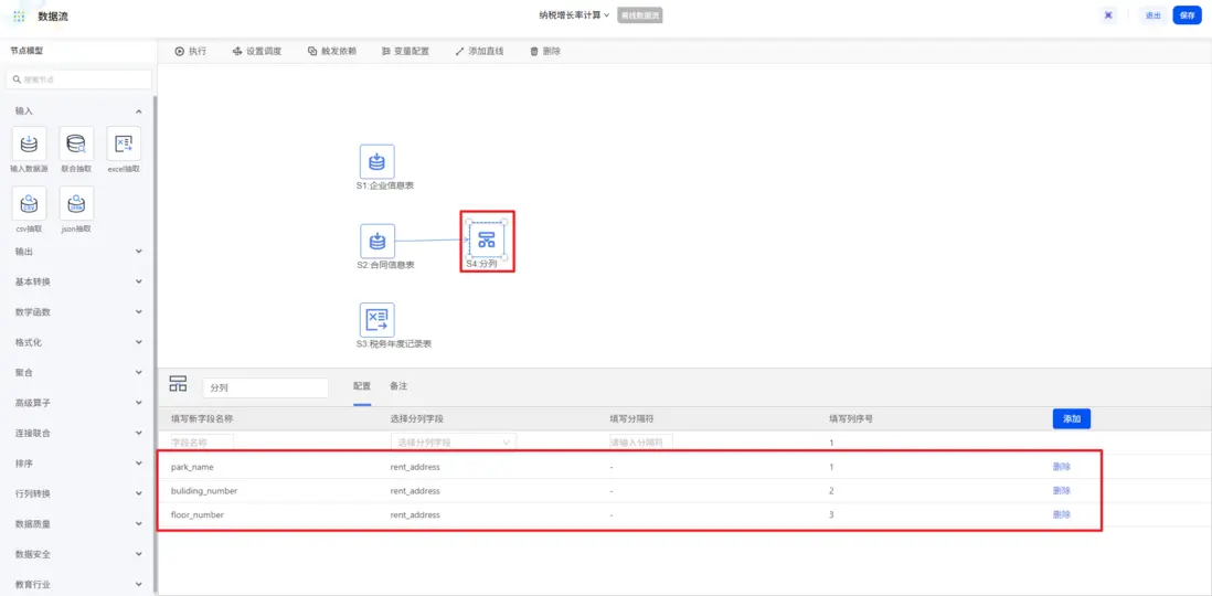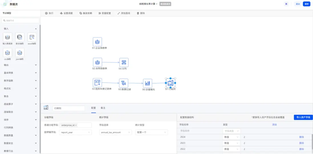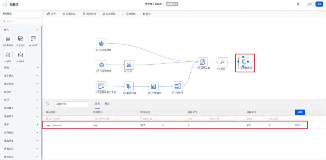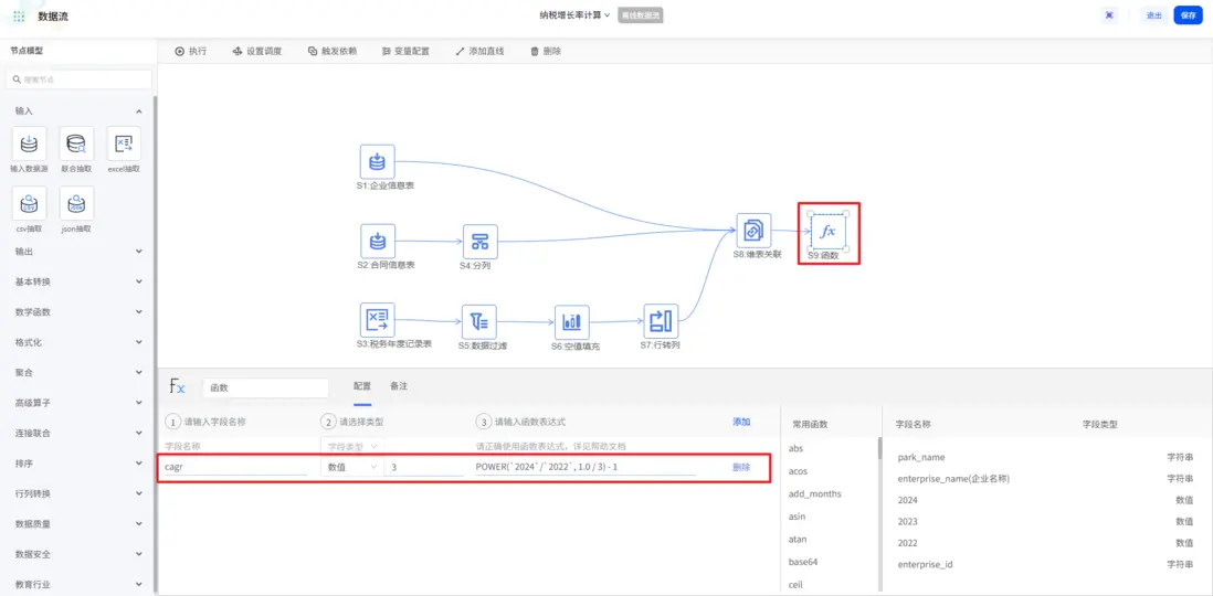 數據整合到位後,進入核心的指標計算環節。通過「函數」節點實現複雜運算,平台內置多種 sparkSQL 函數,無需專業編程能力,只需輸入計算表達式,即可快速完成納税複合增長率計算,非常簡單!