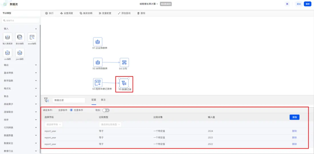 針對“税務年度記錄表”,需要過濾出最近三年的數據以計算有意義的複合增長率。使用「過濾」節點,設置年份條件為2022、2023和2024年,精準篩選出所需數據。