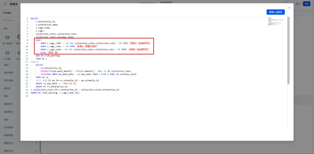 現在我們要進行一個複雜分析,除了之前我們綜合使用各個節點進行處理,可靈活使用「高級SQL」節點,直接編寫SQL語句進行處理,兼顧靈活性和效率。在這段查詢SQL中,將針對納税增長率的排名和收繳率兩個指標對企業進行打標。例如,如果增長率排名小於等於10,同時收繳率又小於90%,標記為“高增長-高逾期風險”的企業,招商或客户部門應主動介入,瞭解其是否存在經營困難,防範壞賬風險。最後我們會得到一份預警清單。