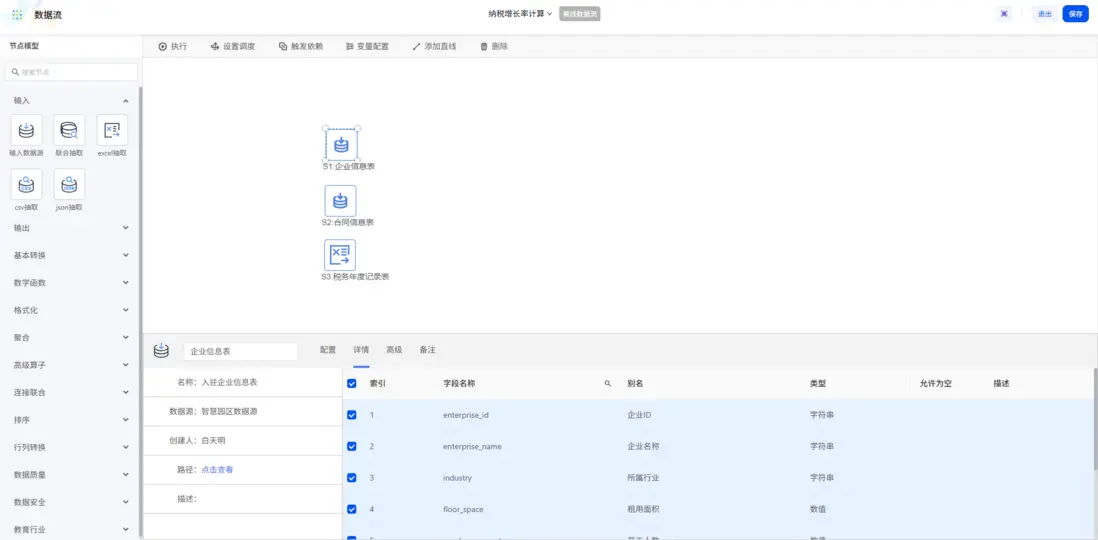 首先,完成多源數據的接入工作。通過“輸入數據源”節點和“Excel抽取”節點,輕鬆導入企業信息表(來自MySQL數據庫)、合同信息表(來自外部接口)和税務年度記錄表(來自Excel)。