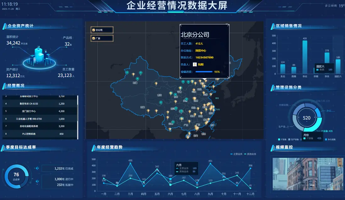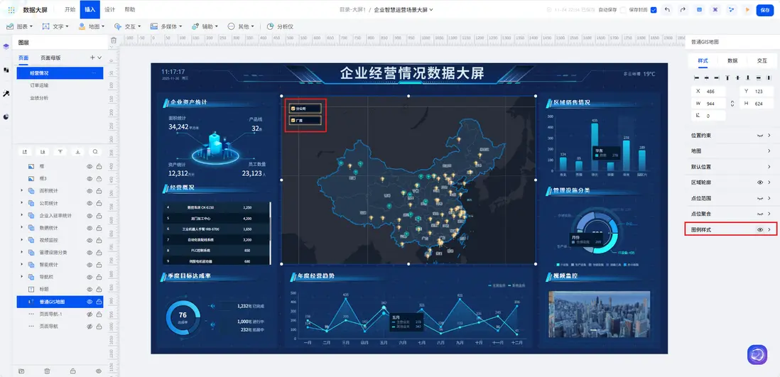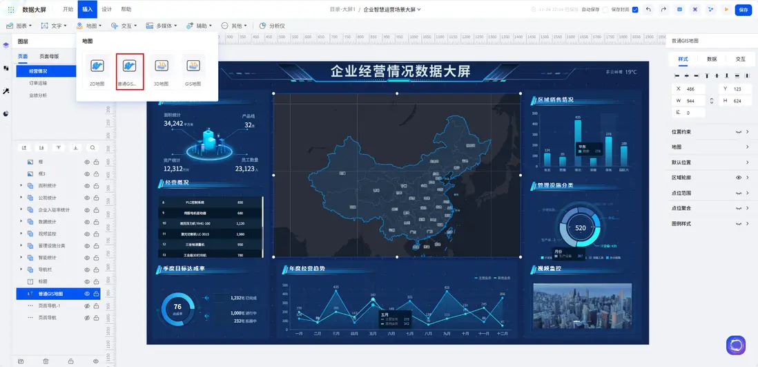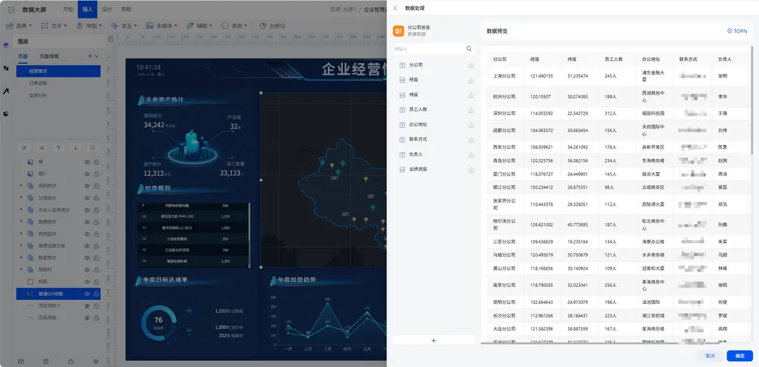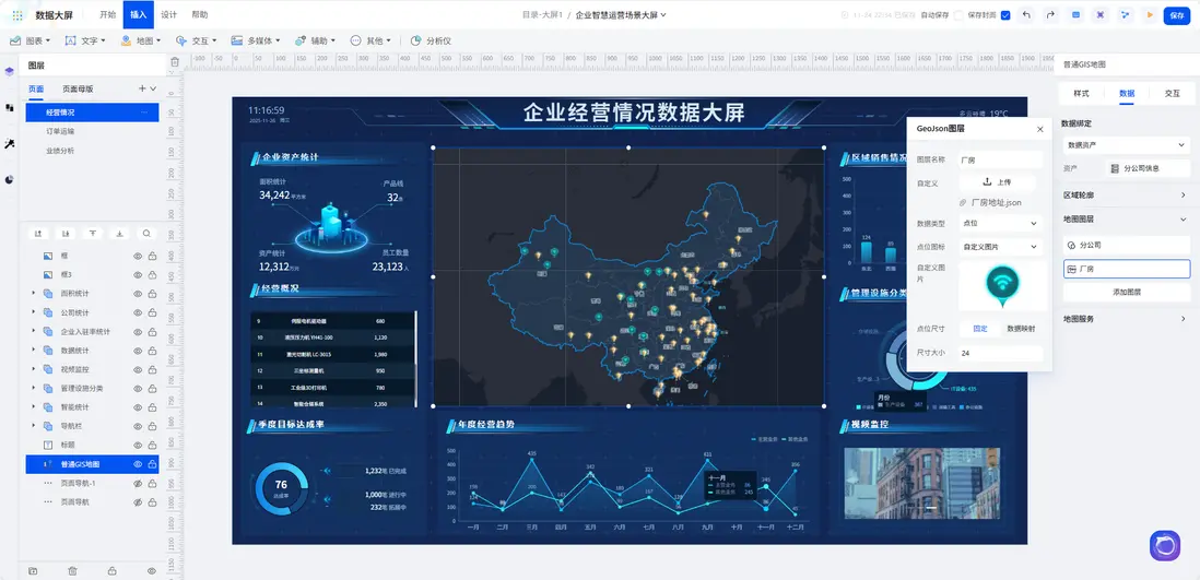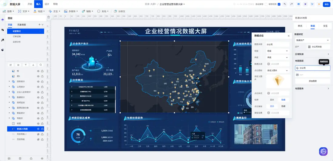 在經營分佈大屏的構建中,由於傳統圖表難以直觀呈現公司地理分佈信息,選用GIS地圖組件來同時展示分公司點位和廠房區域,幫助企業管理者快速掌握資源分佈全貌。