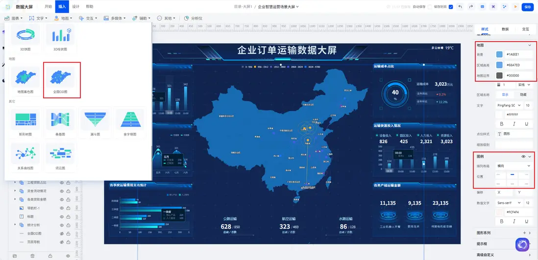 在訂單運輸大屏這一場景中,傳統圖表難以動態呈現物流網絡的流動態勢,因此選用OD圖來直觀展示企業訂單在全國範圍的流動軌跡,讓供應鏈脈絡清晰可辨。首先調整地圖的整體佈局,將圖例設置為上方居中展示,並將地圖背景色設為深藍色,為後續的飛線效果提供清晰的視覺基礎。