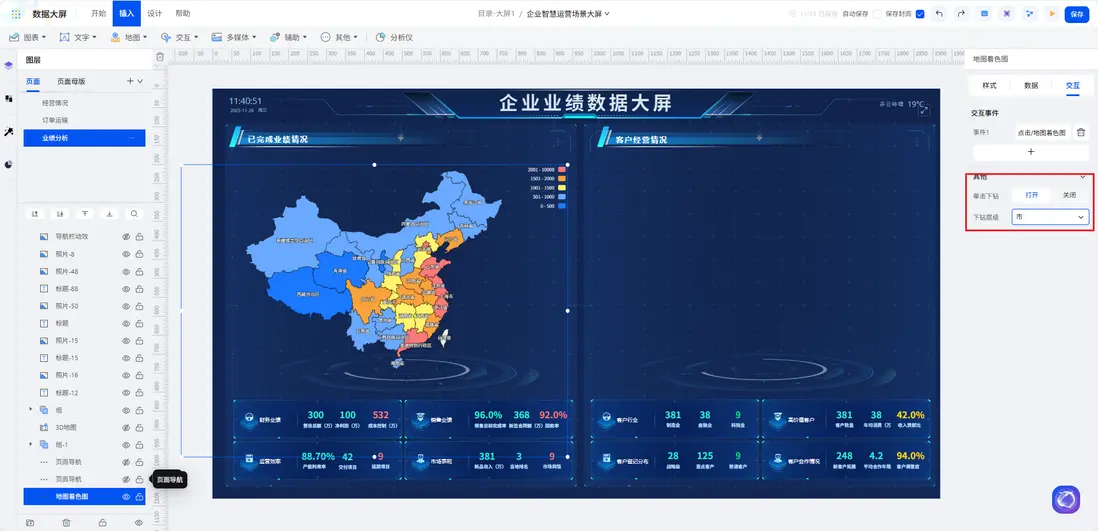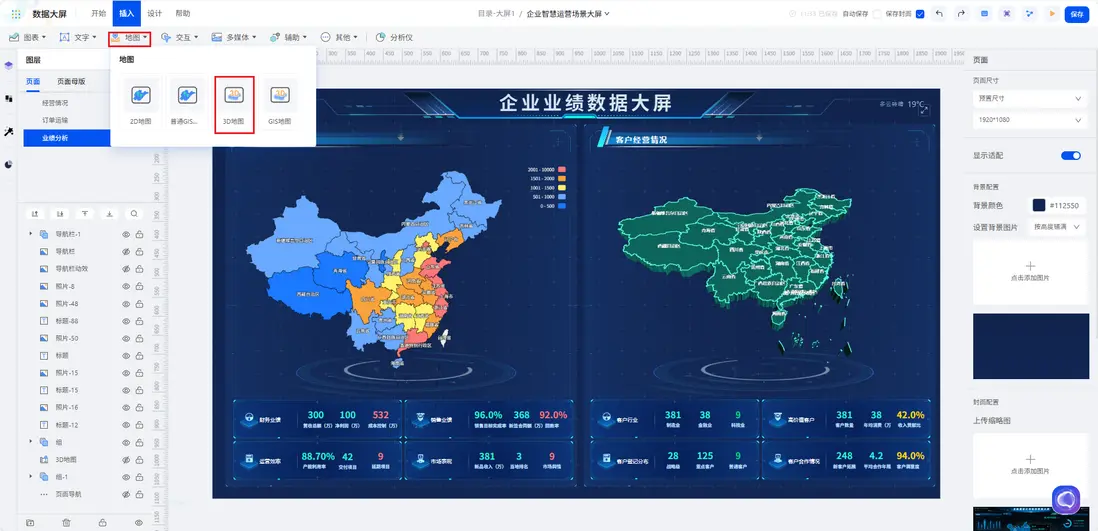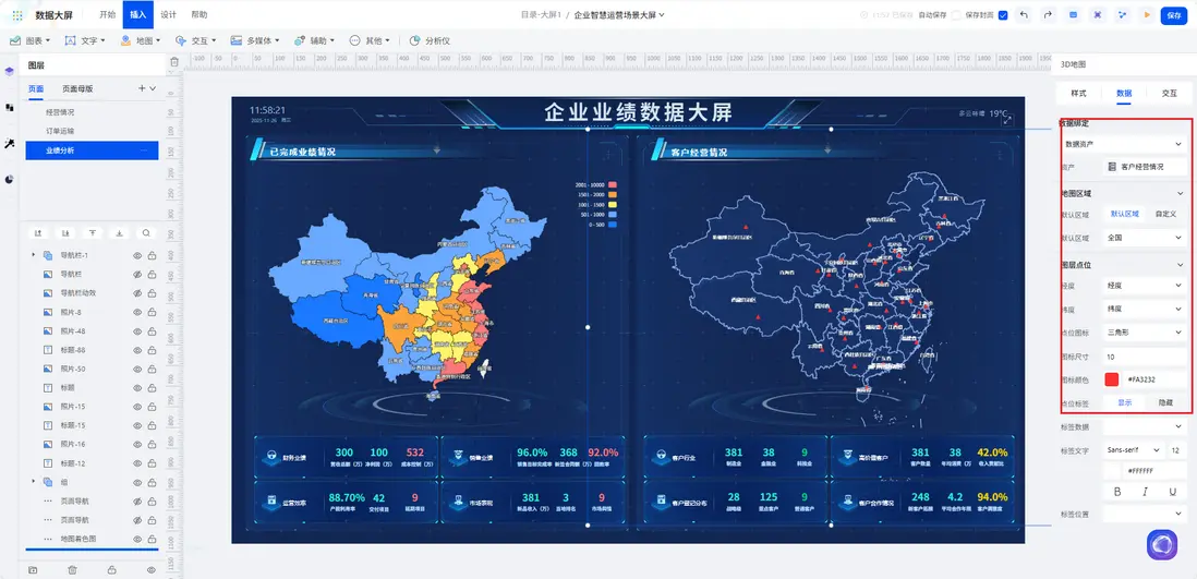 現在,在這個AI生成的智能大屏基礎上,繼續深入配置經營分佈大屏的地圖組件,體驗高效配置模式。