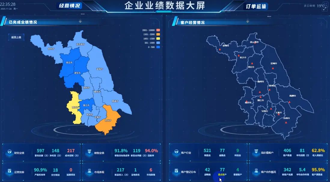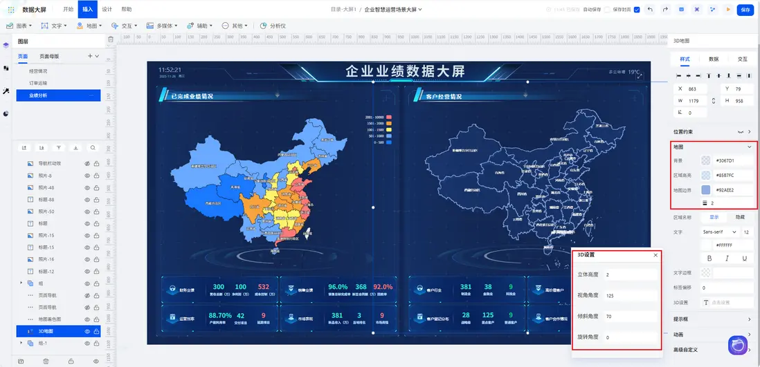 聚焦到企業業績大屏,在這一關鍵場景中,單一的地圖視角已無法滿足從宏觀戰略到微觀執行的穿透式分析需求。我們創新性地融合兩種地圖視角:通過着色圖宏觀展示區域業績完成情況,藉助3D地圖立體洞察客户分佈與訂單規模,實現雙圖聯動的深度分析。