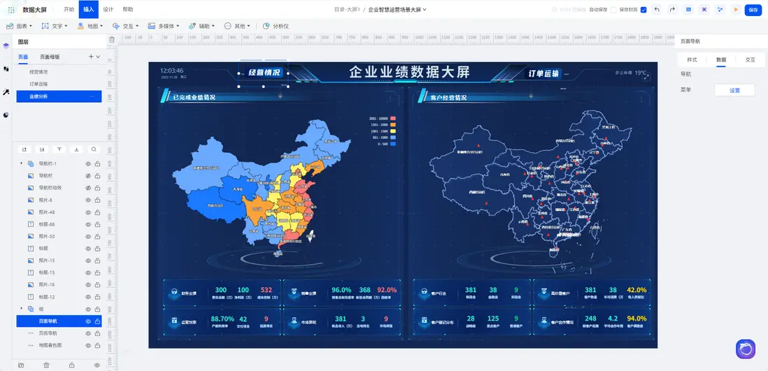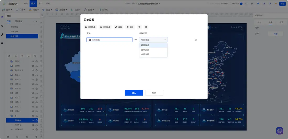 最後,為完整的大屏系統配置導航組件。 在頁面頂部拖入導航菜單,並將其與經營分佈、訂單運輸、業績分析三張大屏精準關聯。用户現在可以通過頂部導航欄,在不同大屏頁面之間實現一鍵切換,形成完整的企業運營分析閉環。