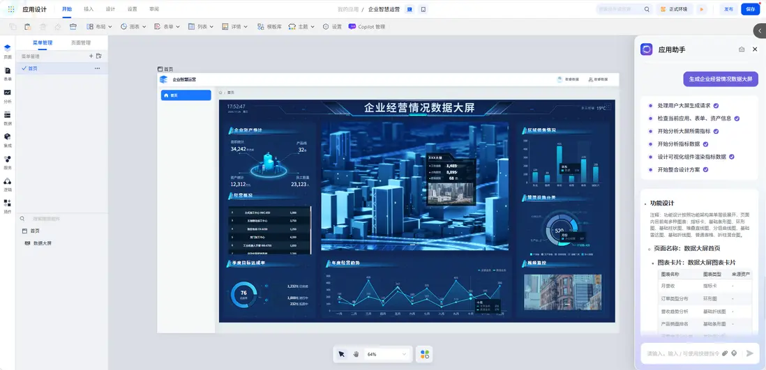 只需對AI描述需求:"生成企業經營管理大屏",AI即可自動生成包含指標卡、趨勢圖表、數據表格等基礎組件的完整頁面佈局。