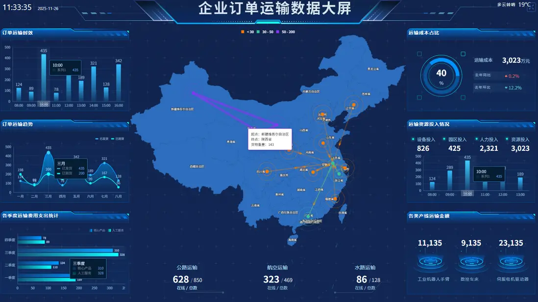 • 50噸以上的大重量訂單:使用青藍色飛線,並設置為快速流動,同時加粗飛線寬度,突顯主要物流通道這些躍動的彩色飛線共同勾勒出企業的供應鏈網絡,整體物流態勢一目瞭然。