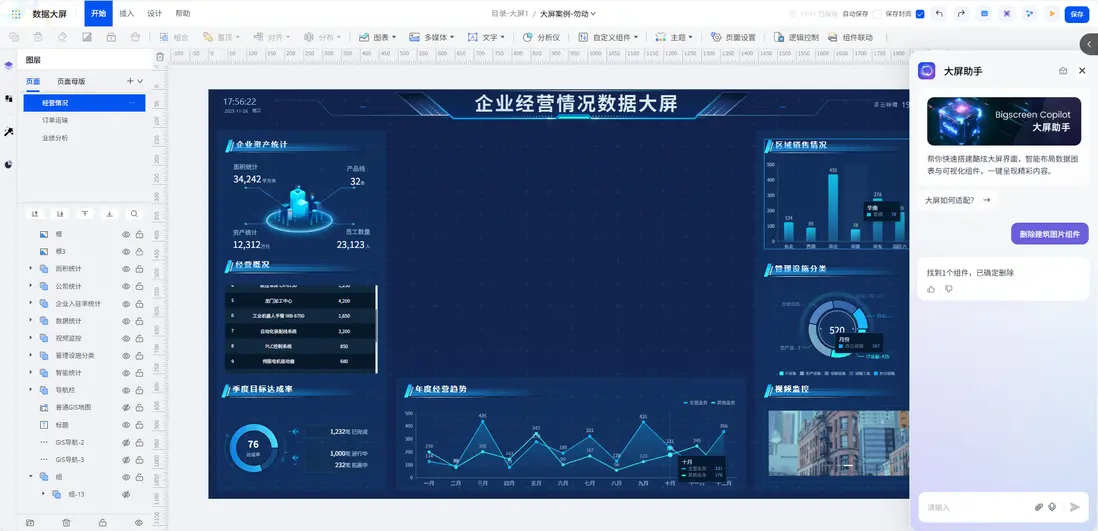 這一創新功能將大屏搭建的初始工作量大幅降低,讓我們能夠將配置精力聚焦在最核心的地圖組件上。再次利用AI刪除大屏中央的組件,為地圖騰出區域。